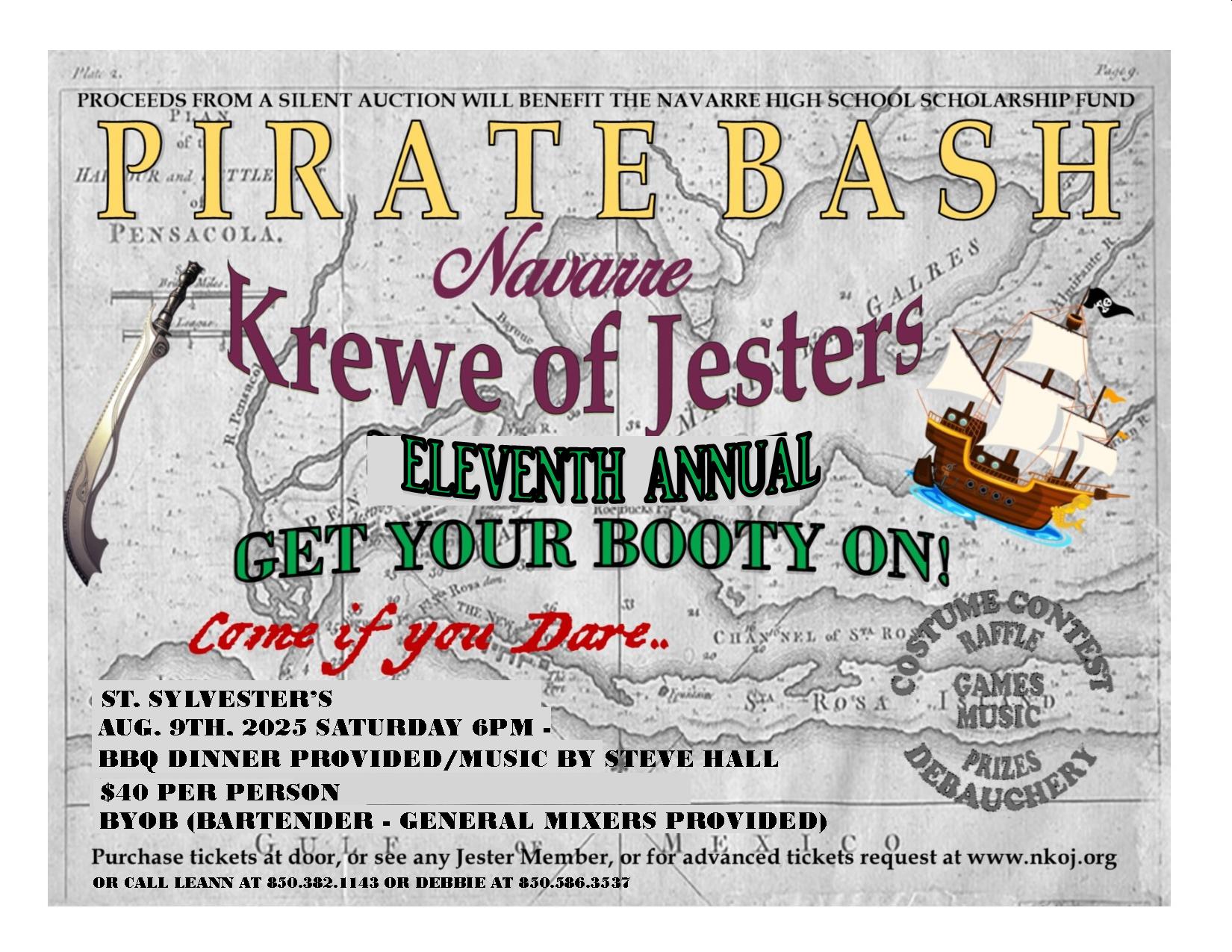 The proceeds from this event helps to fund the 2026 Navarre Krewe of Jesters Mardi Gras Parade and their Scholarship. Tickets are $40 pp or $280 for a table of 8 or $360 for a table of 10, We will serve BBQ Pork and Chicken with all the trimmings, this is a BYOB event, we will supply all the mixers! Music provided by Steve Hall. There will be door prizes, costume contest, fun games and a Silent Auction in which all proceeds from our Silent Auction will go to benefit the NKOJ High School Scholarship. Need Tickets please call or text LeAnn at 850-382-1143 or Debbie at 850-586-3537 or any Jester member! If you are coming as a group or a Krewe please let LeAnn or Debbie know so we can reserve you a table. They look forward to seeing you for a night of Debauchery at the Pirate Bash! MUST BE 21 to enter!!