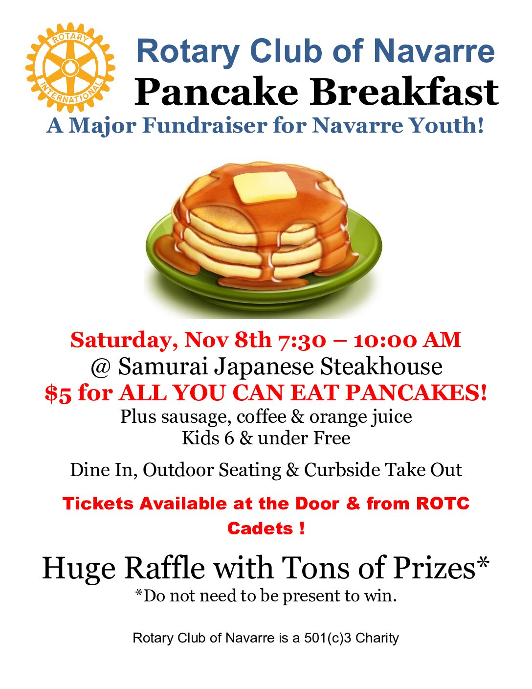 This years pancake breakfast fundraiser is scheduled for Saturday, Nov 8th 2025 from 7:30 AM – 10:00 AM at Samurai Japanese Steakhouse on Hwy 98 in Navarre.