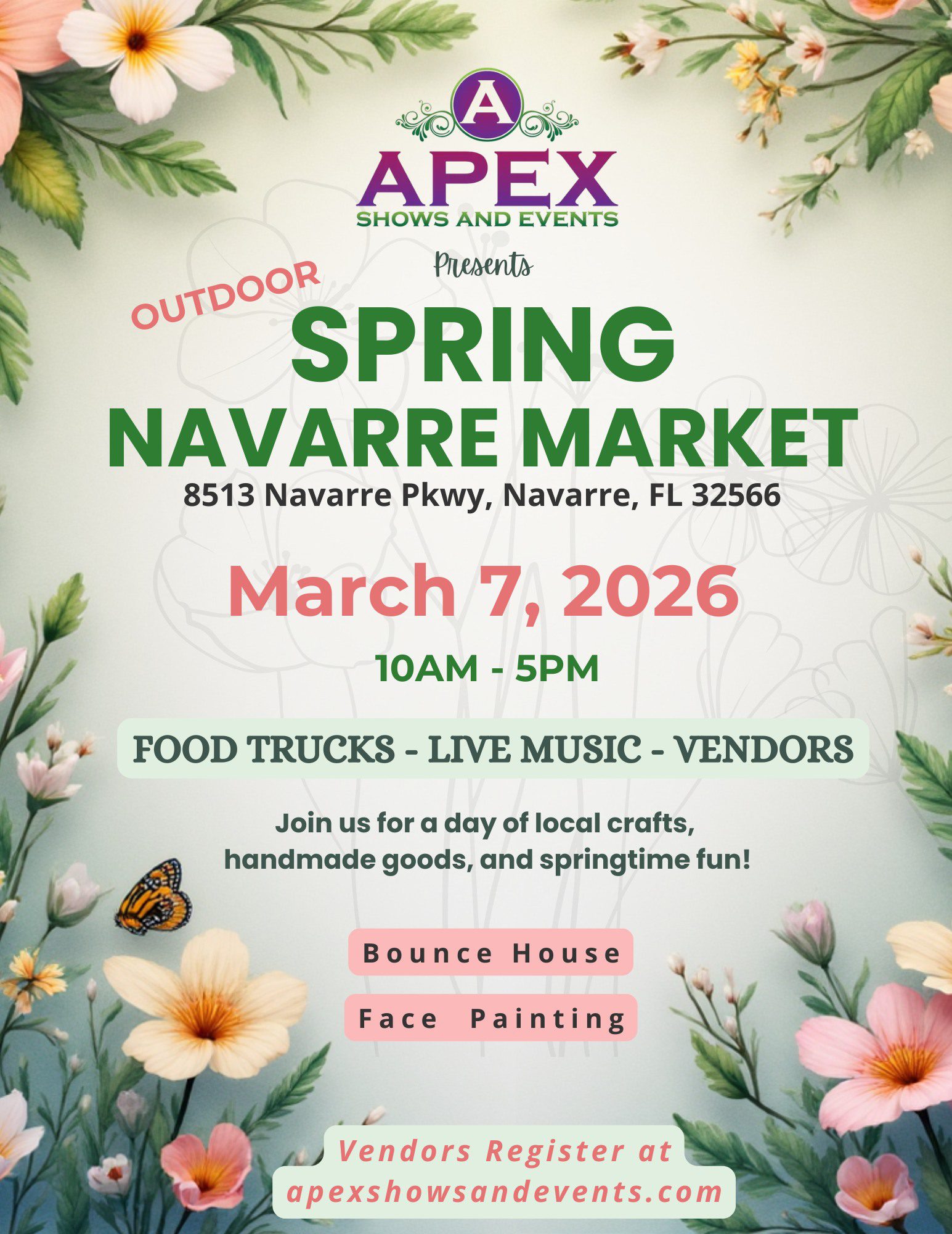 SPRING VIBES ARE BLOOMING IN NAVARRE! Join us for the Outdoor Spring Navarre Market — a full day of food, music, shopping & family fun!    8513 Navarre Pkwy March 7, 2026  10AM–5PM   Live Music Food Trucks Local Vendors  Face Painting & Bounce House for the kiddos!   Vendor spots still open — register […]