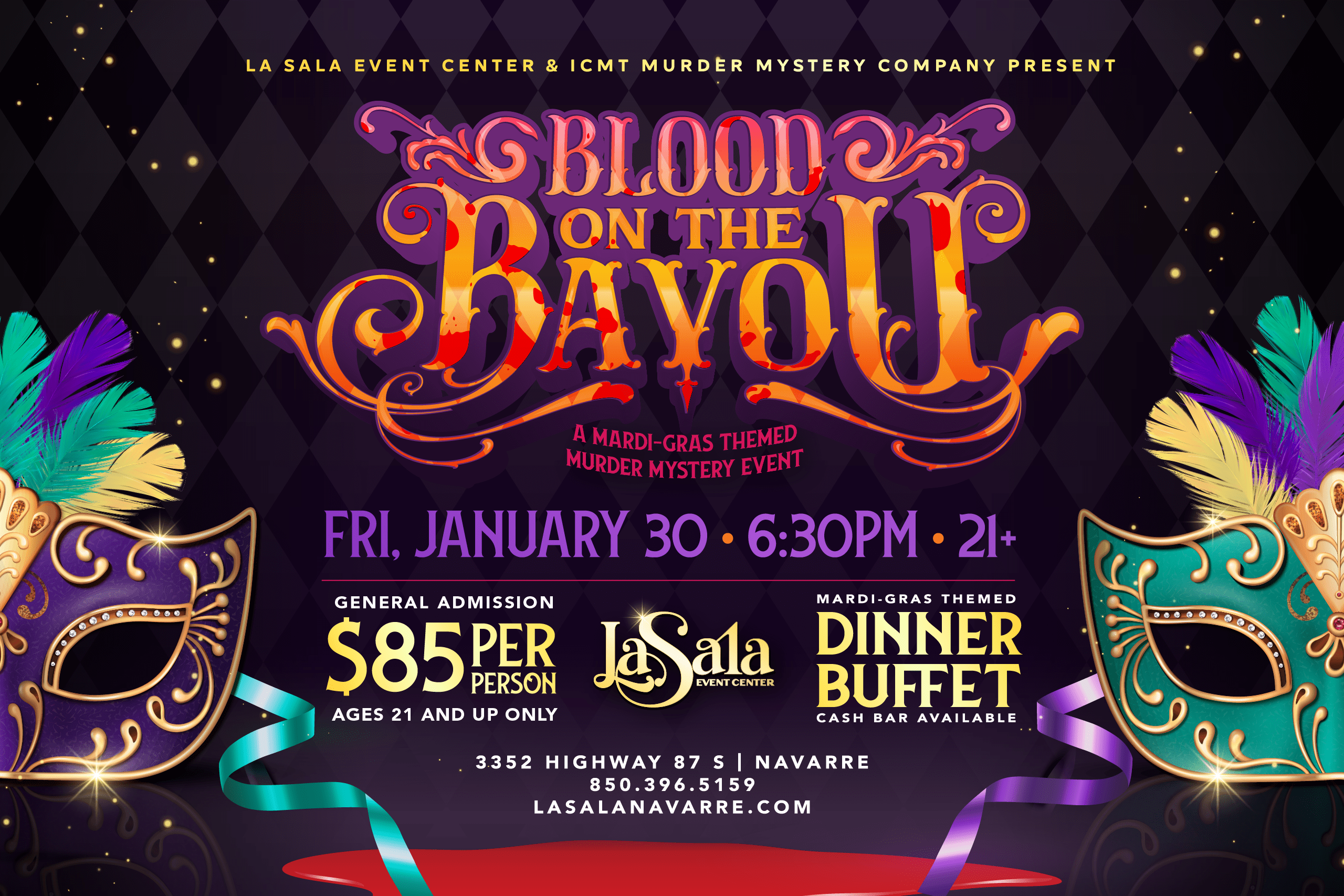 Who’s up for a good old-fashioned whodunit where YOU interrogate suspects, collect evidence and bring the malevolent murderer to justice? Get out your Mardi Gras garb and get ready for a night of mystery, mayhem and murder! Join us at La Sala Event Center for the Blood on the Bayou Mystery Dinner — a thrilling, interactive murder mystery experience with dinner, drinks and drama!